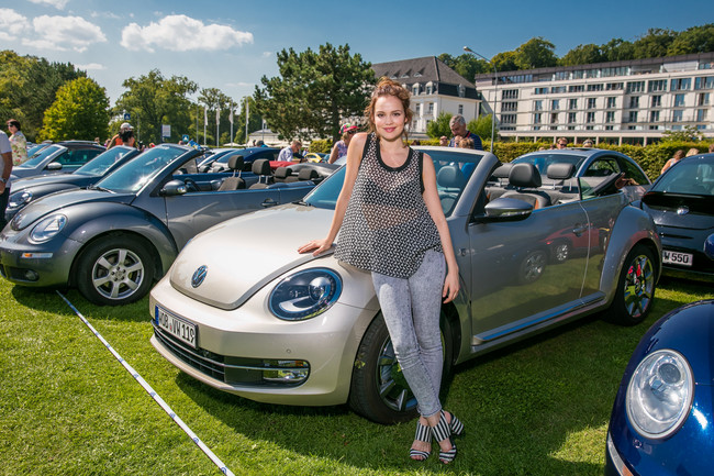 Schauspielerin Emilia Schüle (derzeit an der Seite von David Kross in dem Scifi-Thriller Boy7 in den Kinos zu sehen) ist ein neues Mitglied der Beetle-Gemeinde: "Super Leute, super Stimmung, Sonne und so viele coole Beetle. Unglaublich, welche Mühe sich die Leute hier mit den Fahrzeugen geben." Sie hatte sich für die Veranstaltung aus ihrem proppenvollen Terminkalender frei geschaufelt: "Ich stehe derzeit für die ZDF-Produktion Ku'damm 56 in Berlin vor der Kamera: ein Dreiteiler, der in den 50er Jahren spielt. Ich komme direkt von den Dreharbeiten und am Montag geht die Arbeit weiter. Aber diesen Kurztrip an die Ostsee wollte ich mir auf keinen Fall entgehen lassen", so Shooting-Star Emilia, die neuerdings auch VW-Botschafterin ist. Sie war im eigenen Beetle Cabrio angereist, denn die 22-Jährige ist stolze Neu-Führerscheinbesitzerin: "Seit vier Monaten habe ich den Führerschein in der Tasche und düse damit durch Berlin. Es hat eine gute Größe, eine schöne Form und ist einfach mein Traumauto. Und da es ein Cabrio ist vermittelt es mir ein großes Freiheitsgefühl. Ich sitze begeistert selbst am Steuer."