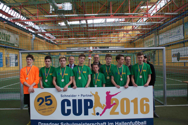 Zum 11. Mal fand in der Sachsenwerk Arena der Schneider + Partner Cup statt, ein Hallenfußballturnier für Schulmannschaften. An den Finalturnieren nahmen rund 400 Schüler aus 16 Grundschulen sowie jeweils 12 Oberschulen und Gymnasien. Angelika Perret, Geschäftsführerin von Schneider + Partner, freute sich über die Popularität des Turniers. „Es ist großartig, wie sich dieses Turnier über die Jahre hinweg entwickelt hat“, sagte sie. „Wenn man die Vorrundenspiele mit einrechnet, haben über 1000 Dresdner Schüler teilgenommen, eine beachtliche Zahl.“ Bei der Siegerehrung überreichte Knut Michel, ebenfalls Geschäftsführer bei Schneider + Partner, Medaillen und Urkunden. Unterstützung erhielt er dabei von Dresdens Schul- und Sportbürgermeister Dr. Peter Lames, Jens Laetsch, Referent der Sächsischen Bildungsagentur, sowie Dynamo Dresdens U19-Co-Trainer und Ex-Bundesligaspieler Cristian Fiél. Dieser war als Jugendcoach begeistert von der Veranstaltung. „Alles was mit körperlicher Betätigung anstatt Smartphones und Spielekonsolen zu tun hat, ist förderlich für den Fußball. Für Kinder in diesem Alter muss – neben der Schule natürlich – Sport das Wichtigste sein.“ Fiél spielte bis letztes Jahr für Dynamo Dresden, war davor unter anderem für Alemannia Aachen und den VfL Bochum aktiv. In ihren Altersklassen holten sich die Oberschule Weixdorf und die 9. Oberschule den Sieg, ebenso wie das Gymnasium Bühlau und das Hans-Erlwein-Gymnasium. Die beiden Gymnasiums-Mannschaften holten sich auch den „Supercup“. Hier traten die jeweils siegreichen Mannschaften aus den Gymnasien gegen die der Oberschulen an. „Dieser Cup hat einen hohen Stellenwert“, sagte Dr. Lames. „Die Spieler haben eine individuelle Klasse und lernen so auch den Mannschaftszusammenhalt. Ein solcher Rahmen motiviert sie sehr.“