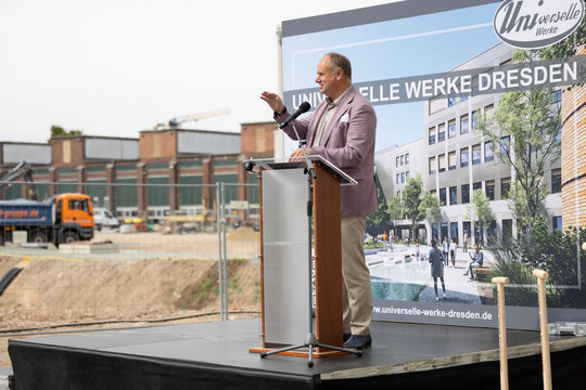 Den symbolischen Spatenstich begleiteten zahlreiche Gäste aus Politik, Stadtverwaltung, Wirtschaft und Wissenschaft. Neben Vertreterinnen und Vertretern der Stadt Dresden waren auch Partnerunter nehmen, künftige Mieter und Akteure der Dresdner Innovationsszene vor Ort, um den offiziellen Baustart des Campusprojektes zu feiern. Dirk Hilbert, Oberbürgermeister der Stadt Dresden, sagte in seiner An sprache: „Die Universellen Werke waren als Teil der Dresdner Industriegeschichte über Jahrzehnte hinweg ein Symbol für Unternehmertum, Erfindergeist und Ingenieurskunst. Diese erfolgreiche Verbin dung zwischen Wissenschaft und Wirtschaft lebt auf neuem Niveau fort dank der Investitionen in den Traditionsstandort. Jetzt zeigt sich, dass es richtig war, dass Technologiezentrum und Landeshaupt stadt Dresden trotz vieler Risiken die Wiederbelebung des Standortes gewagt und vorangetrieben ha ben. Auf dem Hightech-Campus, der bis 2028 wächst, ist Platz für Technologieentwicklungen und Büros in einem innovativen Umfeld. Ich danke der IMMOPACT Immobilen GmbH, die mit diesem Quartier ein kraftvolles Bekenntnis zum wachsenden Wirtschafts- und Wissenschaftsstandort Dresden zeigt.“