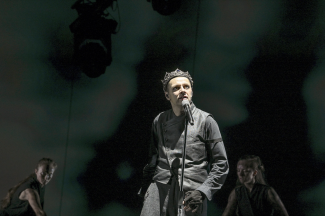 Ein spürbares Schaudern geht durch die Reihen, wenn die drei Hexen von Birnam, angeführt von Gruoch (gespielt von Hannelore Koch), die Bühne betreten oder an Stangen herunterhängen und Macbeth süße, verstörende Lieder ins Ohr säuseln. Sie prophezeien seine Sicherheit bis der Wald von Birnam nach Dunsinane kommt. Angespornt von Lady Macbeth (gespielt von Nadja Stübiger) erfährt die Figur des Macbeth eine schauerliche Verwandlung zum Königsmörder. Der ehemalige König Duncan (gespielt von Ahmad Mesgarha) taucht auch nach seinem Tod immer wieder auf, wie auch andere Opfer Macbeths. Die Schwelle zwischen Leben und Tod, Schlafen und Erwachen wird hier so ineinander verworren, dass die Grenzen beinah verschwinden. Macbeth selber wird immer verrückter, abgestumpfter, aber auch gebrochen und einsam. Am Ende verliert er alles und jeden, auch seine Frau. Dies ist der einzige Moment, in dem ein kleiner Funke Menschlichkeit hervorkommt und er sagt: „Sie hätte sich ruhig noch ein bisschen Zeit lassen können.“ Das ist alles. Mehr Mensch steckt in Dresdens Macbeth nicht mehr. Letztendlich wird er durch eine List vom heranschleichenden Wald von Brinam überwältigt. Bis zuletzt bereut er nichts und stirbt mit den Worten: „Mein Tod wird es auch nicht besser machen.“ Die gleichen Worte aus dem Anfangsmonolog. Danach Stille.