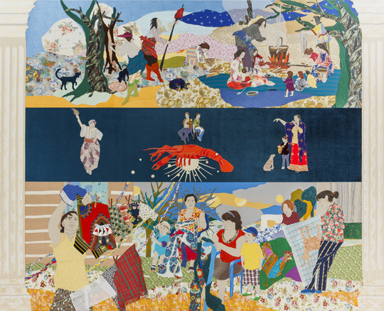 Die polnische Künstlerin Małgorzata Mirga-Tas verbindet in ihren textilen „Malereien“ Vergangenheit und Gegenwart und erzählt Geschichten von Familie, Gemeinschaft, Solidarität und Selbstermächtigung. Ihr Fokus liegt auf dem Leben von Rom*nja-Gemeinschaften, Europas größter ethnischer Minderheit, wobei sie besonders die Perspektive der Frauen hervorhebt. Durch die bildmächtige Kombination verschiedener Textilien und Muster schafft sie ein intimes Bild vom Alltag der Rom*nja, oft verknüpft mit historischen Narrativen. Das Kunstmuseum Wolfsburg zeigt mit der Ausstellung erstmals in diesem Umfang das Werk der Künstlerin in Deutschland, darunter Teile des Zyklus Re-enchanting the World, mit dem Małgorzata Mirga-Tas seit ihrem Auftritt 2022 auf der Venedig-Biennale für internationales Aufsehen sorgte.