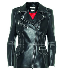 Alexander McQueen präsentiert uns nun diese luxuriös-schwere Jacke für die Übergangszeit. Das schwarze Modell wurde in Italien aus butterweichem Glattleder gefertigt und mit sichtbaren Stichnähten in kontrastierendem Weiß akzentuiert.