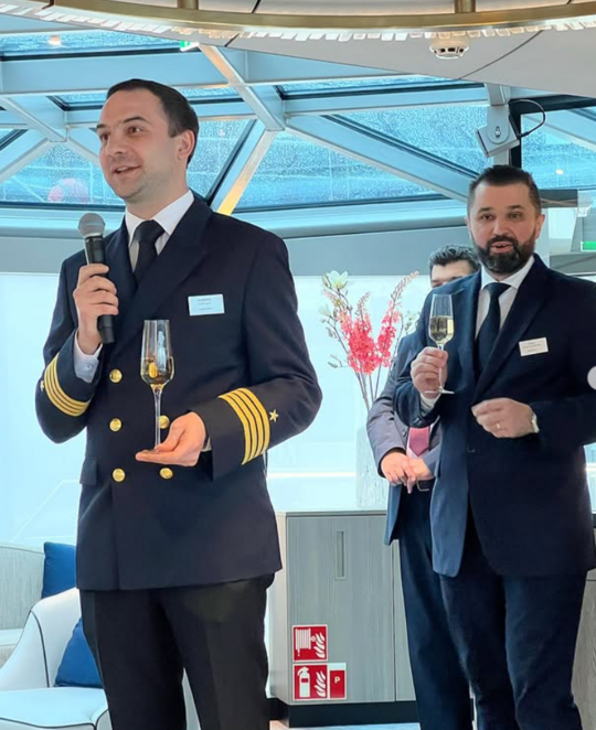 Captain Volodymyr Semenov und Hoteldirector Ilija Marojevic begrüßen die Gäste auf eine sehr ruhige und zurückhaltende Art.