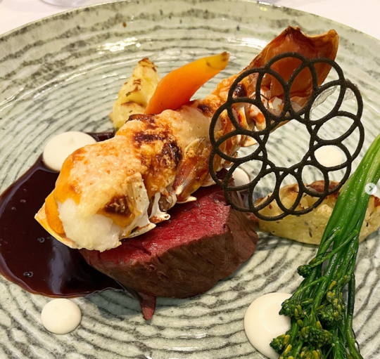 Trocken gereiftes Rindfleisch | Langostino | Gewürzte Charon -Sauce und Remy Martin- Pfeffersauce