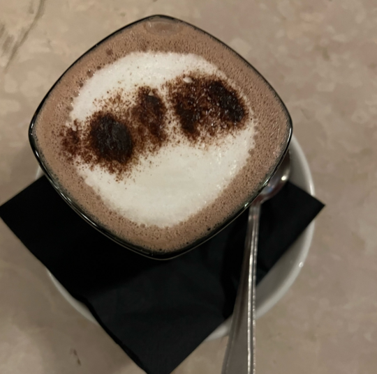 Sowohl im Restaurant, in der kleinen Bar oder vor dem Kamin kann man verschiedene Kaffeesorten wählen. So spät entscheiden wir uns für einen koffeinfreien Lattemacchiato . Gut, dass er angeboten wird. Hafermilch gab es zwar nicht, dafür andere Sorten.