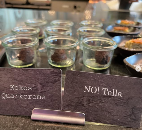 Nutella ist zum Beispiel ein Motto. Der Schokoladen - Aufstrich hier wird besonders gesund zubereitet. Es gibt Gurkenwasser, Kekse aus Dinkel und Hanf, warmen Mohnkuchen, Mango- und Erdbeerlassi, viele Müslis, einen Mixer für Smoothies und eine Orangen - Presse für frischen O-Saft.