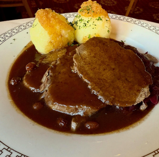 Sächsisch, lecker, gut: der Sächsische Sauerbraten mit Rosinensoße, Apfelrotkohl und Kartoffelklößen im Coselpalais .