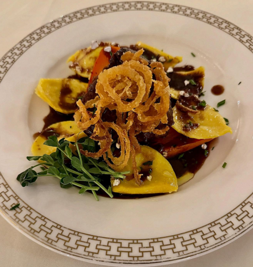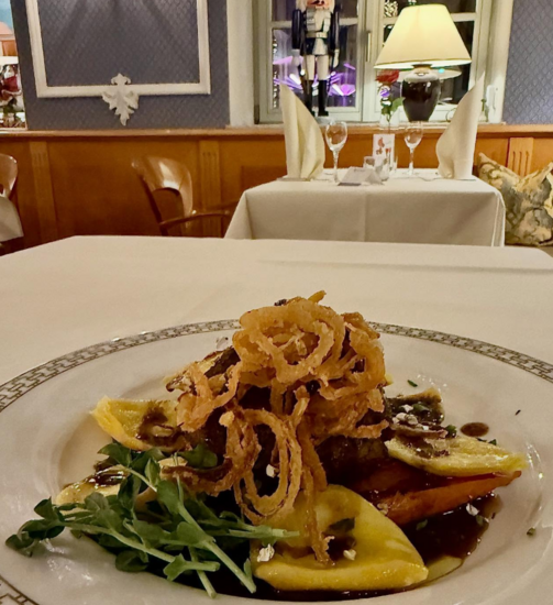 Rosa gebratenes Rinderfilet mit Sauce Bordelaise, glasierten Karotten und Kürbisravioli (38,90 Euro)Sauerbraten (27,90 Euro)
