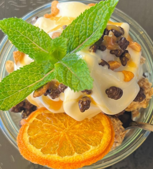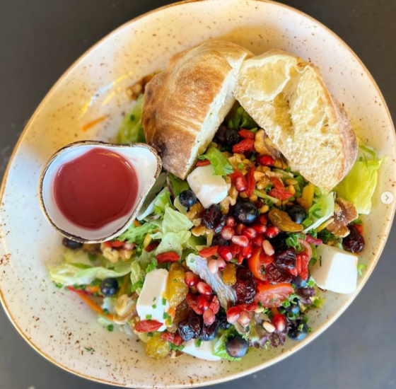 Gemischter Salat, Beerenmix, geröstete Pinienkerne, Walnuss-Crumble, Blaubeeren, Granatapfelkerne, vegane Hirtenwürfel, Granatapfel-Himbeer-Vinaigrette (Foto 1)