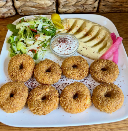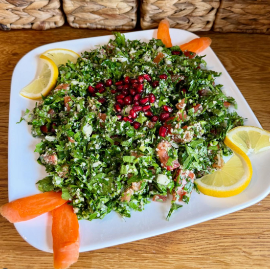 Hier noch ein paar Hauptspeisen aus Papa’s Haus in der Neustadt : Tabule (Petersilie, Gemüse und Apfel), Falafel und das Tagesgericht (heute Hähnchenkeule mit Gemüse und Reis).