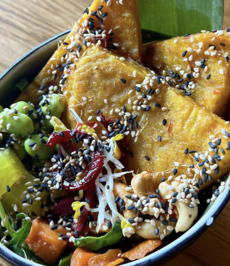 Mangostreifen mit Edamame Bohnen, Süßkartoffeln, Spinat , Saisonsalat, Sesamdressing und knusprige Reiscracke.