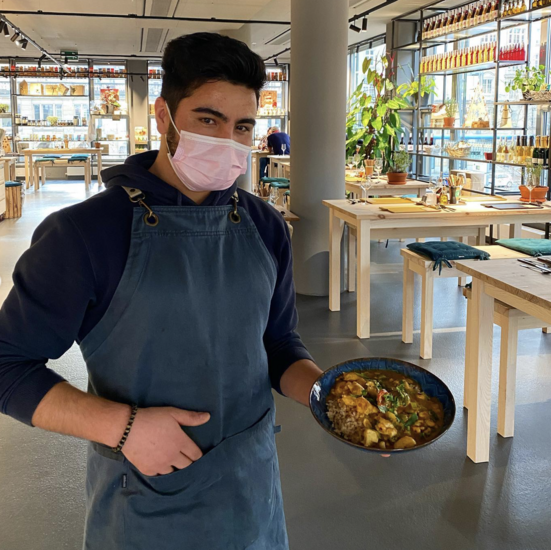 Das Angebot ist nicht sehr groß, aber alles ist Bio. Wir probieren zwei Hotbowls. Man kann Beilagen wählen zwischen Glasnudeln, Reis und Bulgur. Es schmeckt sehr mild. Kräftiger ist das Chicken Indian Curry (14,50 Euro). Ihr seht das im vorigen Post in der Hand von Kellner Reza.